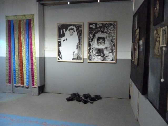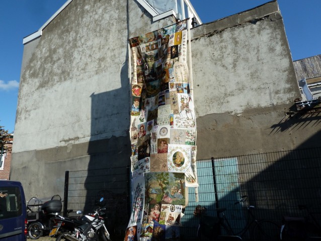Buiten als blikvanger een vlag van allerlei borduurwerken.